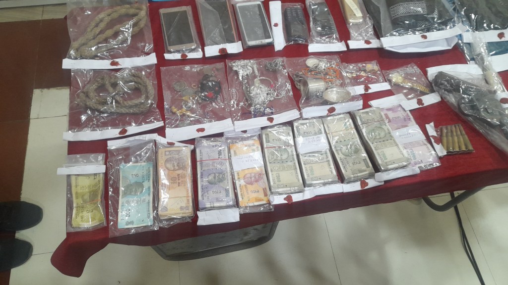 एक देशी कट्टा और 05 जिंदा कारतूत । नकद रकम ₹2,36,050 के साथ लगभग 1 तोला सोना और 3 तोला चांदी जुमला कीमती – 3,50,000 रूपये ।