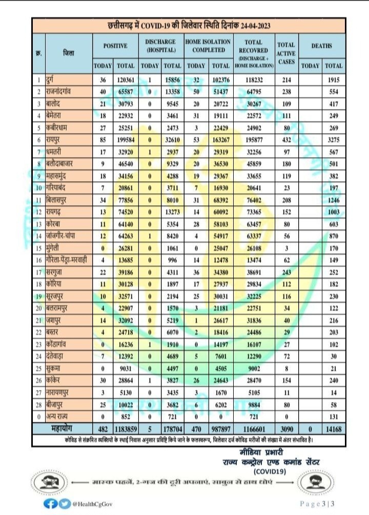 प्रदेश में आज जिला नारायणपुर से 3 बलरामपुर से 4, बस्तर से 4, गौरेला पेंड्रा – मरवाही से 4, गरियाबंद से 7, दंतेवाड़ा से 7, बलौदाबाजार से 9, सूरजपुर से 10, कोरिया से 11, कोरबा से 11, जांजगीर-चांपा से 12, रायगढ़ से 13, जशपुर से 14, धमतरी से 17, बेमेतरा से 18, महासमुंद से 18, बालोद से 21, सरगुजा से 22, बीजापुर से 25, कबीरधाम से 27, कांकेर से 30, बिलासपुर से 34, दुर्ग से 36, राजनांदगांव से 40, रायपुर से 85 कोरोना संक्रमित मरीज मिले हैं। शेष जिलों में कोरोना का कोई नया मामला नहीं आया है।