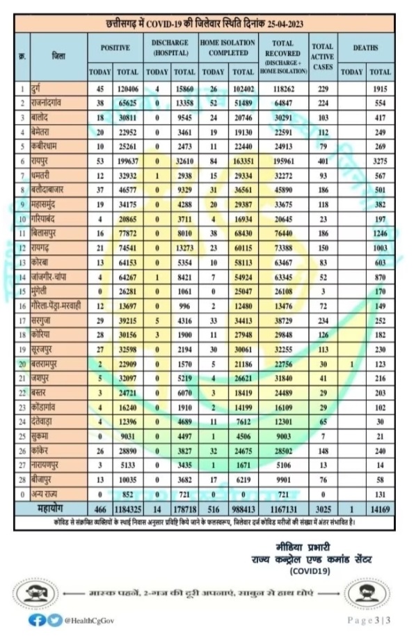 छतीसगढ़। छत्तीसगढ़ में पिछले दो दिनों से लगातार 400 से अधिक मामले मिल रहे है। देश में भी कोरोना के मामलों में इजाफा देखा गया है। छत्तीसगढ़ में बीते 24 घंटों में कोरोना के 466 नए केस मिले हैं। जिसके बाद एक्टिव मरीजों की संख्या 3025 हो गई है। प्रदेश में पॉजिटिविटी दर कम होकर 8.06 फीसदी हो गई है। मंगलवार को 26 जिलों में कोरोना के मरीज मिले हैं। रायपुर, दुर्ग, राजनांदगांव, बिलासपुर में सबसे ज्यादा एक्टिव केस हैं।