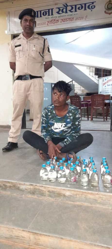 अवैध शराब बिक्री करने की जरिये मुखबीर की सूचना मिला की अवंती बाई चैक बाजार अतरिया में अधिक मात्रा अवैध अधि मात्रा देशी शराब रखकर बिक्री हेतु छिपाकर रखा है कि सूचना पर थाना खैरागढ़ एवं साईबर टीम बनाकर रवाना किया गया।ं मौके पर जाकर घेरा बंदी कर रेड कार्यवाही कर रंगे हाथो पकड़ा गया नाम पता पुछने पर अपना नाम जयकरण विश्वकर्मा पिता स्व0 रामस्वरूप वर्मा उम्र 35 वर्ष साकिन बाजार अतरिया थाना खैरागढ़ जिला केसीजी छ0ग0 का होना बताये। आरोपी के पास से कुल 30 पौवा देशी प्लेन शराब 5.400 लीटर किमती 2400/- को जप्त कर आरोपी को हिरासत मे लेकर शराब रखने के संबंध मे वैध लायसेंस की मांग की गई ।