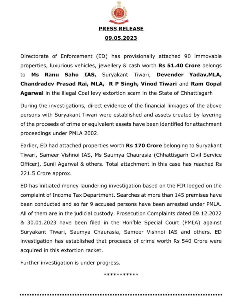 और अब तक 9 अभियुक्तों को पीएमएलए के तहत गिरफ्तार किया गया है। ये सभी महीनो से न्यायिक हिरासत में हैं। जांच के दौरान ईडी को जबरन वसूली रैकेट में 540 करोड़ रुपये के वसूली के इनपुट्स मिले है। ओपी ने आरोप लगाते हुए कहा कोयले घोटाले सहित आबकारी घोटाले में करोड़ों रुपए की वसूली सत्ता धारी दल से जुड़े नेताओ के इशारे पर की गई । यह पैसा छत्तीसगढ़ महतारी के गरीब जनता के हक का पैसा है।