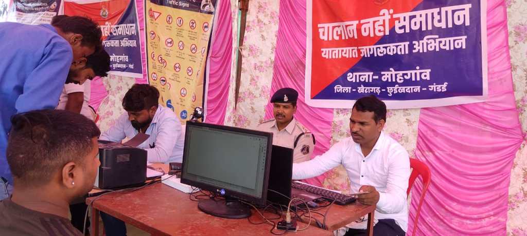 मोहगांव । थाना मोहगांव पुलिस जिला के .सी .जी .के द्वारा यातायात जागरूकता लाने मौके पर ही वाहन चालकों के दस्तावेज कराये जा रहे दुरूस्त पुलिस अधीक्षक अंकिता शर्मा के मार्गदर्शन में एवं अतिरिक्त पुलिस अधीक्षक नेहा पांडे पुलिस अनुविभागीय अधिकारी गंडई प्रशांत खांडे के निर्देशन में एवं जिला परिवहन विभाग के सहयोग से थाना मोहगांव पुलिस द्वारा ग्राम पैलीमेटा के साप्ताहिक बाजार में यातायात नियमों का पालन कराने यातायात व्यवस्था दुरूस्त करने यातायात जागरूकता अभियान चालान नहीं समाधान के तहत आज ग्राम पैलीमेटा के बाजार में वाहन चालकों का लाईसेंस बनाने हेतु।