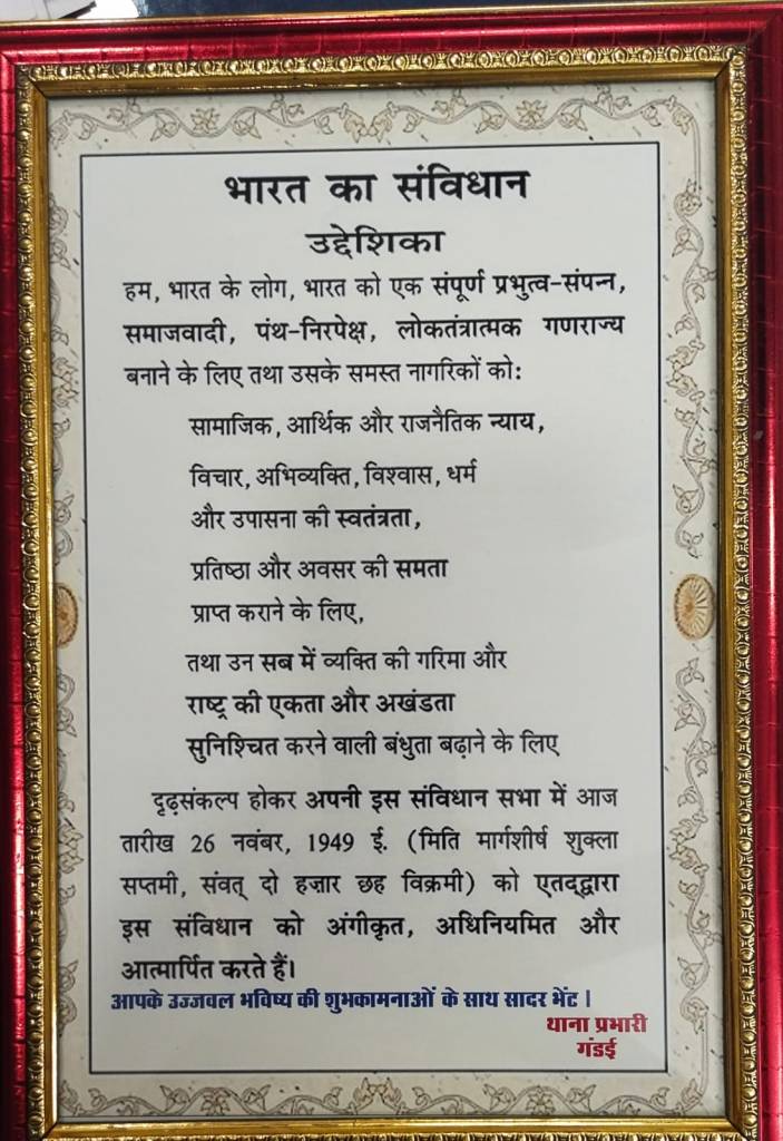 संविधान की प्रस्तावना स्मृति चिन्ह के रूप मे प्रदान कर उनके उज्जवल भविष्य की कामना की गई जिससे मेघावी बच्चो मे आगामी चुनौतियो के लिये उनका आत्मविश्वास बढा वही उनके परिजनो के चेहरो मे एक नयी मुस्कान देखने को मिली थाना गंडई द्वारा प्रतिभावान मेघावी छात्र,छात्राओ,के आगामी उच्च शिक्षा के सबंध मे उनकी योजनाओं की जानकारी लेकर पुलिस विभाग से उनके उज्जवल भविष्य के लिये हर सभंव मदद करने का आश्वासन भी दिया गया ।