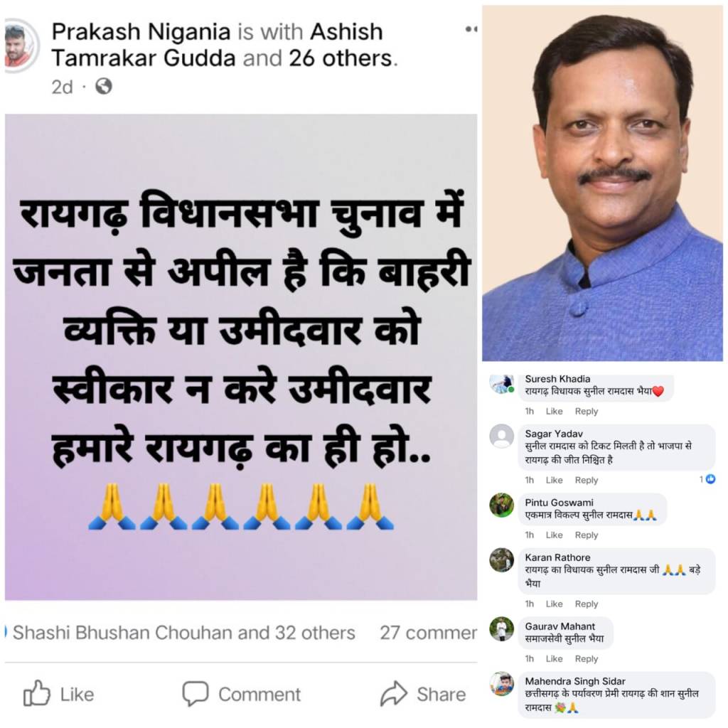 रायगढ़ । विधानसभा चुनाव में कुछ ही महीने बाकी है हर कोई भाजपा नेता अपनी दावेदारी पेश कर रहा है जिसमें भाजपा नेता समाजसेवी पर्यावरण प्रेमी सुनील रामदास की दावेदारी को अनदेखी में नहीं ली जा सकती सुनील रामदास वरिष्ठ नेताओं में गिनती आते हैं रायगढ़ विधानसभा में सबसे चाहते युवा नेता सुनील रामदास हैभाजपा की राजनीति में है ,मजबूत पकड़ सुनील रामदास अग्रवाल भले ही अभी खुलकर सामने नही आ रहे है ।
