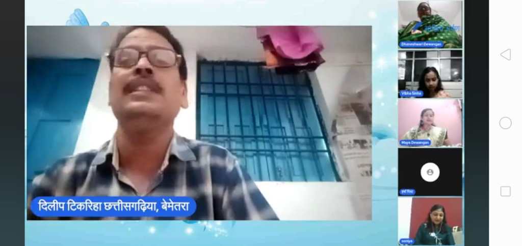 कार्यक्रम के अंत में ,कार्यक्रम के मुख्य अतिथि आदरणीय दिलीप टिकरिहा को , कार्यक्रम की संचालिका माया देवांगन द्वारा काव्य पाठ हेतु आमंत्रित किया गया,छत्तीसगढ़ी भाषा शैली में, लोकगीत ( सावन महीना सुहावन लागे ना ) उनके द्वारा प्रस्तुत किया गया।