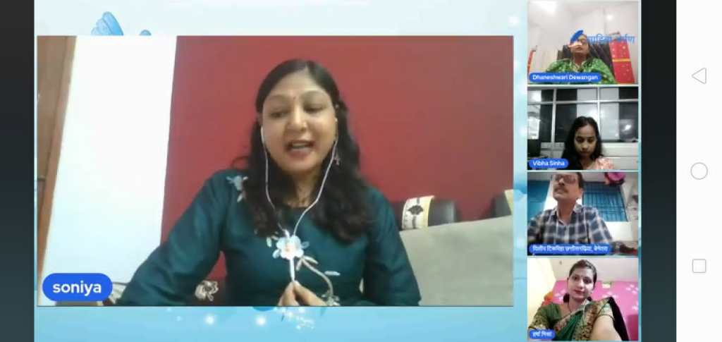 तत्पश्चात कार्यक्रम की रूप रेखा आगे बढ़ाते हुए , मंच की अध्यक्षा सोनिया गोयल को मंच पर आमंत्रित किया गया। उनके द्वारा भी कार्यक्रम की शोभा बढ़ाते हुए।
