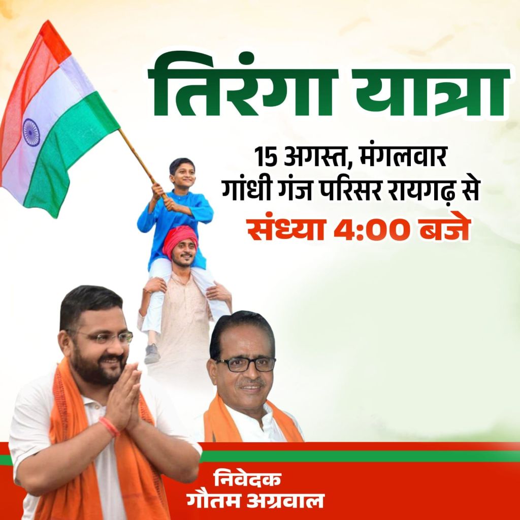 रायगढ़ शहर के देशभक्तों के मन के अनुकूल गौतम अग्रवाल द्वारा निकली गई तिरंगा यात्रा का शुभारंभ रायगढ़ स्थित गांधी गंज परिसर से किया गया। गांधी गंज से तिरंगा यात्रा महात्मा गांधी चौक होते हुए, कारगिल चौक, गुरुद्वारा रोड़ से गद्दी चौक होते हुए मंदिर चौक पहुँची। तत्पश्चात मंदिर चौक से शहीद चौक, गोपी टॉकीज होते हुए अग्रसेन चौक, सुभाष चौक से होते हुए बेटी बचाओ – बेटी पढाओं स्टेशन चौक पहुँची, तिरंगा यात्रा में नगर के प्रतिष्ठित गणमान्य नागरिकों, युवाओं, महिलाओं, बच्चों, पुलिसकर्मियों व मीडियाकर्मियों सहित हज़ारों की संख्या में उपस्थित रहे।