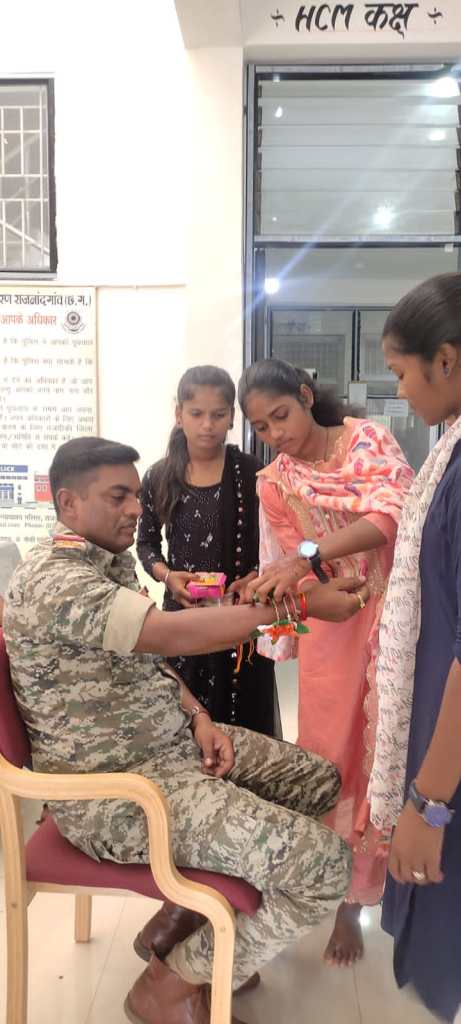 गंडई । अति नक्सल प्रभावित ग्राम की बालिकाओ के साथ थाना परिसर में मनाया गया रक्षा बंधन त्योहार। हमर बेटी हमर मान एवं अभिव्यक्ति एप की जानकारी दिया गया।