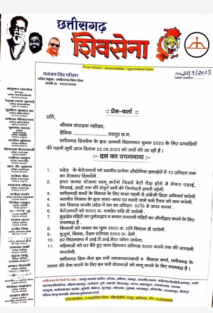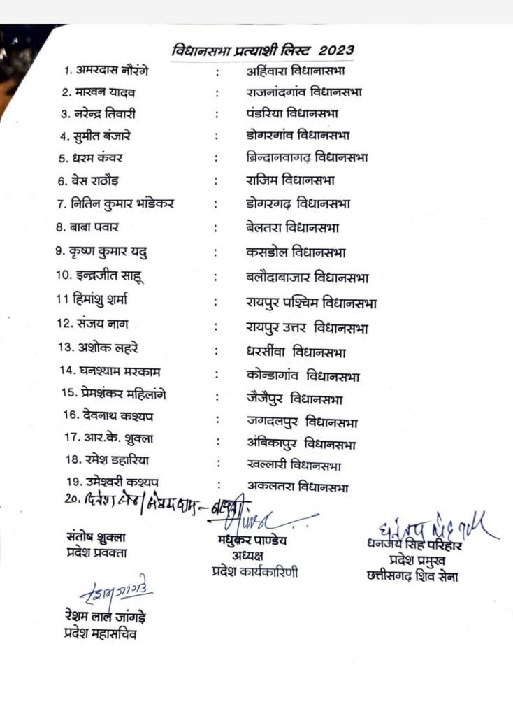 रायपुर। शिव सेना ने छत्तीसगढ़ में होने वाले विधानसभा चुनाव के लिए प्रत्याशियों की पहली सूची जारी करते हुए, 20 विधान सभा के प्रत्याशियों की घोषणा की है।
