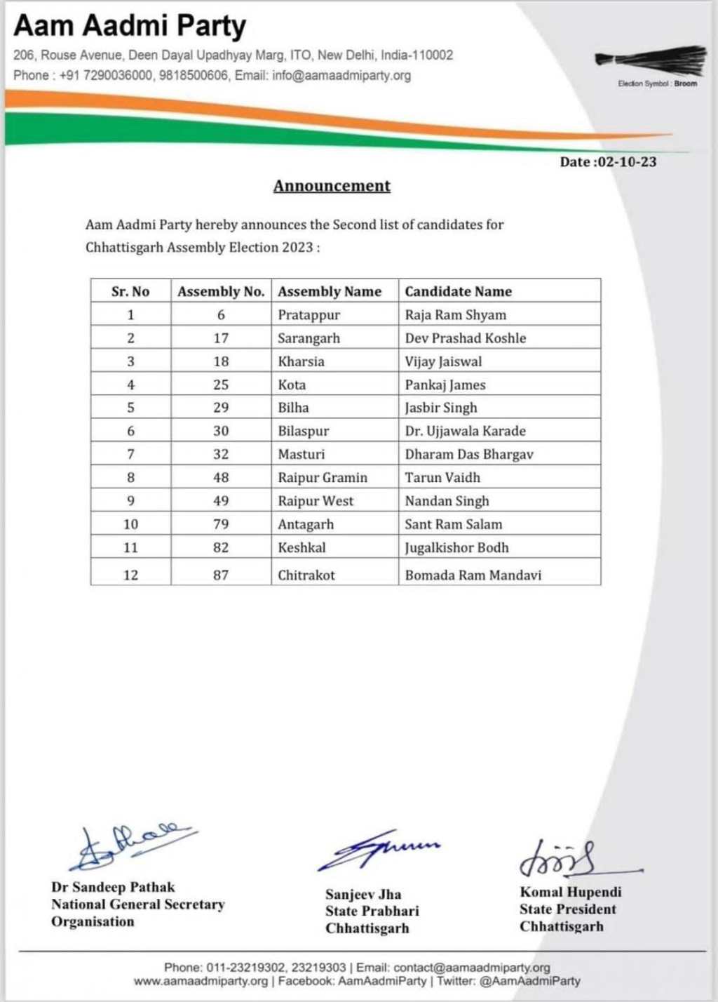 इस सूची में कुल 12 प्रत्याशियों को चुनावी मैदान में उतारा है, विधानसभा चुनाव को लेकर आम आदमी पार्टी दूसरी बार छत्तीसगढ़ में किस्मत आजमा रही है, दिल्ली और पंजाब में सरकार बनाने के बाद पार्टी ने अब छत्तीसगढ़ में फोकस किया है, इससे पहले पहली सूची में कुल दस उम्मीदवारों को टिकट दिया था।