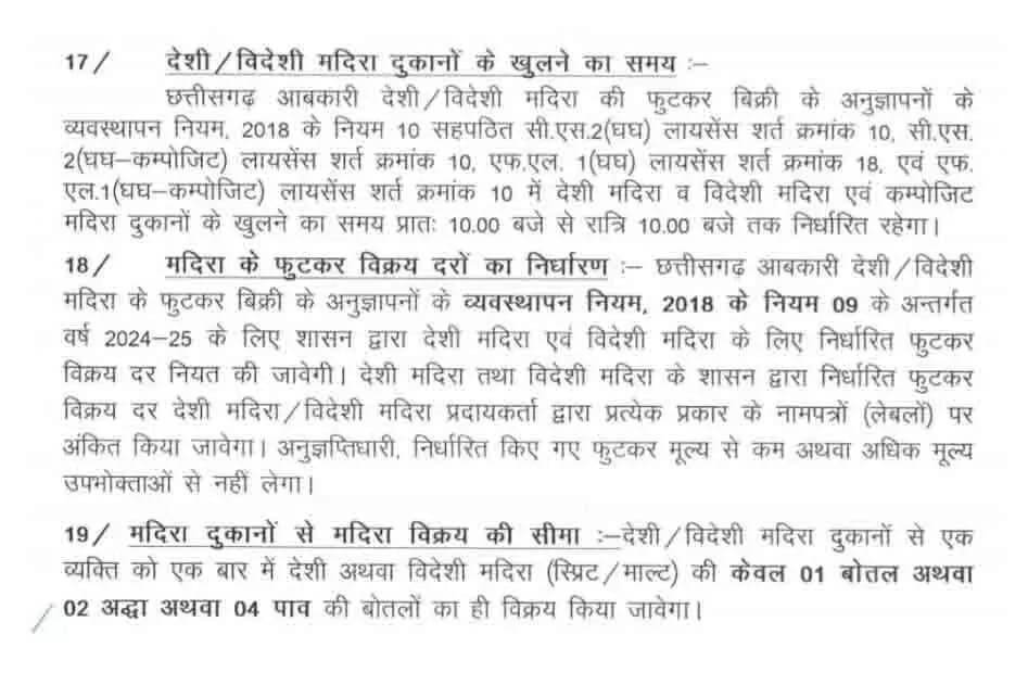 एक बार में 2 अद्धी या 4 पौवा की लिमिट तय की गई है, इस तरह दुकान से प्रति व्यक्ति एक बार में 2 अद्धी या 4 पौवा भी खरीद सकता है,गौरतलब हैं कि छत्तीसगढ़ में आबकारी विभाग के नियम में कई बदलाव किए गए हैं, नये नियम के तहत शराब की कीमतें जहां बढ़ाई गई हैं।