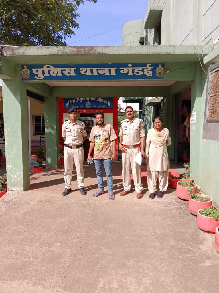 लगातार प्रयास कर 24 घण्टे के अंदर गंडई टीम द्वारा आरोपी खेमचंद पिपरोल पिता स्व0 रामसाय पिपरोल उम्र 39 साल साकिन न्यू कृष्णा नगर स्टालर हाऊस शासकीय स्कूल के पास सुपेला भिलाई थाना सुपेला जिला दुर्ग को ग्राम चारभाठा घुपसाल थाना गैंदाटोला जिला राजनांदगांव में छुपा हुआ था एवं वहां से भी भागने के फिराक में था जिसे घेराबंदी कर पकडकर थाना लाकर आज दिनांक 18.04.2024 को विधिवत् गिरफ्तार कर न्यायिक हिरासत में भेजा गया है। उक्त कार्यवाही में उप निरीक्षक शंकर लाल टंडन, प्र.आर. सुन्दरू राम चन्द्रवंशी, आरक्षक नरेश ठाकुर, उमेश बंजारे, भूपेन्द्र कौशिक, महिला आरक्षक शिखा निर्मलकर का सराहनीय भूमिका रहा।