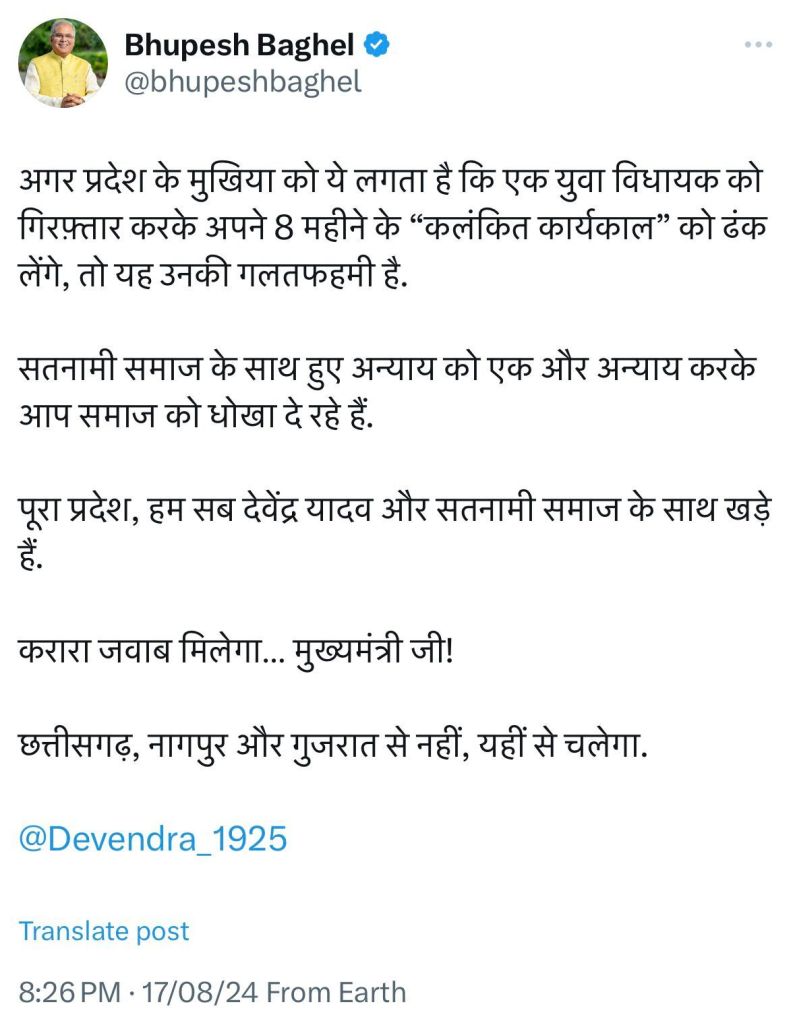 सतनामी समाज के लोगों की हमने आवाज उठाई, सतनामी समाज को न्याय मिलना चाहिए,अगर सरकार को लगता है कि देवेन्द्र यादव को गिरफ्तार करने से उनकी पीठ थपथपा सकती है,तो मैं तैयार हूं हम संविधान के लिए, आम आदमी के लिए लड़ाई लड़ेंगे, हम कानूनी लड़ाई लड़ेंगे,सरकार से हम नहीं डरेंगे”