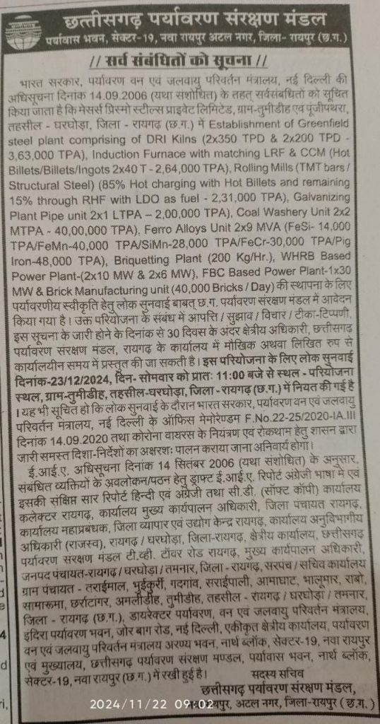घरघोड़ा तहसील के ग्राम कॉमेडी इमेज 23 दिसंबर की प्रातः 11:00 बजे इस प्लांट के विस्तार के लिए लोग सुनवाई रखी गई है, प्रिज्म स्टील पूंजी पत्र क्षेत्र में स्थापित एक ऐसा उद्योग है, जो अपने स्थापना के बाद से लगातार पर्यावरण को दूषित कर रहा है,अब इसकी क्षमता बढ़कर कई गुनी हो जाएगी। इस प्लांट की फर्जी ईआईए रिपोर्ट के आधार पर पर्यावरण विभाग प्लांट के विस्तार के लिए पूरी मदद भी कर रहा है।