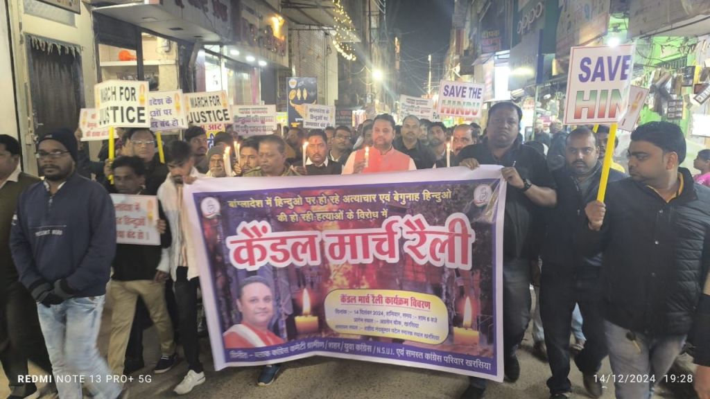 रायगढ़ /खरसिया। बांग्लादेश में हिंदू समुदाय पर हो रहे अत्याचारों के खिलाफ पूरे भारत में विरोध प्रदर्शन हो रहा है, छत्तीसगढ़ में इस मुद्दे पर पहली बार खरसिया में एक मौन कैंडल मार्च का आयोजन किया गया, जिसका नेतृत्व पूर्व मंत्री और खरसिया विधायक उमेश पटेल ने किया। उमेश पटेल की अगुवाई में खरसिया ब्लॉक कांग्रेस कमेटी द्वारा आयोजित यह मौन कैंडल मार्च सैकड़ों नागरिकों और समर्थकों के व्यापक समर्थन के साथ अग्रसेन चौक से प्रारंभ हुआ।