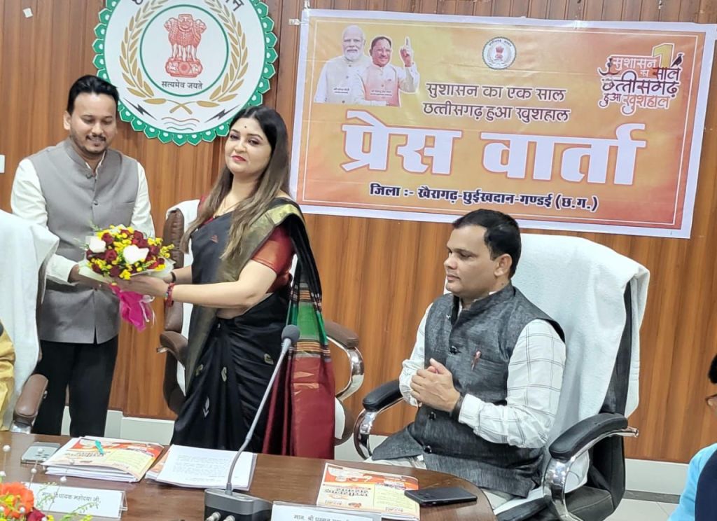 मुख्यमंत्री विष्णु देव साय सरकार में सुशासन के 01 साल पूरा होने पर “सुशासन का एक साल, छत्तीसगढ़ हुआ खुशहाल“ थीम पर जिला कलेक्टोरेट स्थित सभा कक्ष में प्रेसवार्ता का आयोजन किया गया,इस अवसर पर पंडरिया विधानसभा क्षेत्र की विधायक भावना बोहरा ने प्रेस वार्ता ली, उन्होंने मुख्यमंत्री साय के नेतृत्व में बीते 01 साल में किए गए कार्यों एवं उपलब्धियों के संबंध में जानकारी दी।