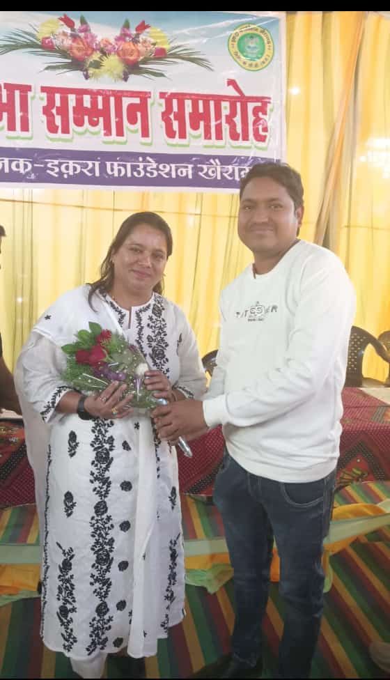 गौरतलब है कि इकरा फाउंडेशन के तत्वाधान में जिला स्तर पर आयोजित फातिमा शेख प्रतिभा सम्मान समारोह में 70 प्रतिशत से अधिक अंक अर्जित करने वाले कुल 46 छात्रों का सम्मान किया गया और सभी छात्र-छात्राओं को स्मृति चिन्ह एवं प्रशस्ति पत्र देकर सम्मानित किया गया. प्रतिभा सम्मान समारोह में कक्षा 12वी में प्रथम स्थान हासिल करने वाली खैरागढ़ की तशहीर जमाल कुरैशी को 5000 रूपये नगद, स्मृति चिन्ह व प्रशस्ति पत्र देकर सम्मानित किया गया. 12वी में दूसरा स्थान हासिल करने वाली तस्कीन फातिमा को 3000 रूपये नगद, स्मृति चिन्ह व प्रशस्ति पत्र एवं 12वी में तीसरा स्थान हासिल करने वाली सानिया शेख को 1100 रूपये नगद, स्मृति चिन्ह एवं प्रशस्ति पत्र देकर सम्मानित किया गया. कक्षा 10वी में प्रथम स्थान पर माहेनूर अंजुम को 5000 रूपये नगद, स्मृति चिन्ह व प्रशस्ति पत्र देकर सम्मानित किया गया. 10वी में दूसरा स्थान हासिल करने वाली सानिया शेख को 3000 रूपये नगद, स्मृति चिन्ह व प्रशस्ति पत्र वही 10 वी में तीसरा स्थान हासिल करने वाली मो. तज़कीर कुरैशी को 1100 रूपये नगद, स्मृति चिन्ह एवं प्रशस्ति पत्र देकर सम्मानित किया गया. इस दौरान कक्षा 6वी में प्रथम मन्नत खान, कक्षा 7वी में प्रथम मो. फरहान, कक्षा 8वी में प्रथम अनीशा नाज़, कक्षा 9वी में प्रथम निशा खान व कक्षा 11वी में प्रथम आने वाली मिस्बाह खान सहित कुल 46 छात्र छात्राओं को भी स्मृति चिन्ह व प्रशस्ति पत्र देकर सम्मानित किया गया. खास बात ये रही कि कुल सम्मानित 46 छात्रों में 33 बेटियां रही जो बहुत खुशी की बात है.