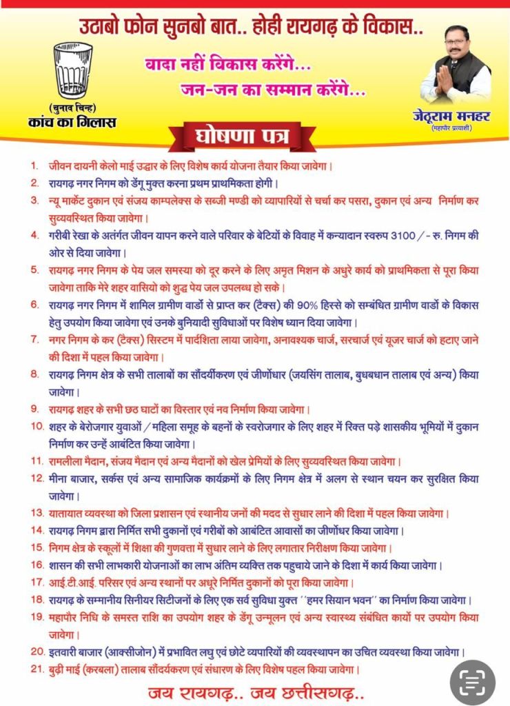 जेठू राम मनहर ने आज प्रेस कॉन्फ्रेंस कर अपना चुनावी घोषणापत्र जारी किया, जिसमें 21 बिंदुओं पर शहर के विकास का रोडमैप प्रस्तुत किया गया,उन्होंने कहा कि यदि जनता उन्हें महापौर के रूप में चुनती है, तो वे कुर्सी का लालच नहीं करेंगे और जनता के बीच रहकर उनकी समस्याओं का समाधान करेंगे।