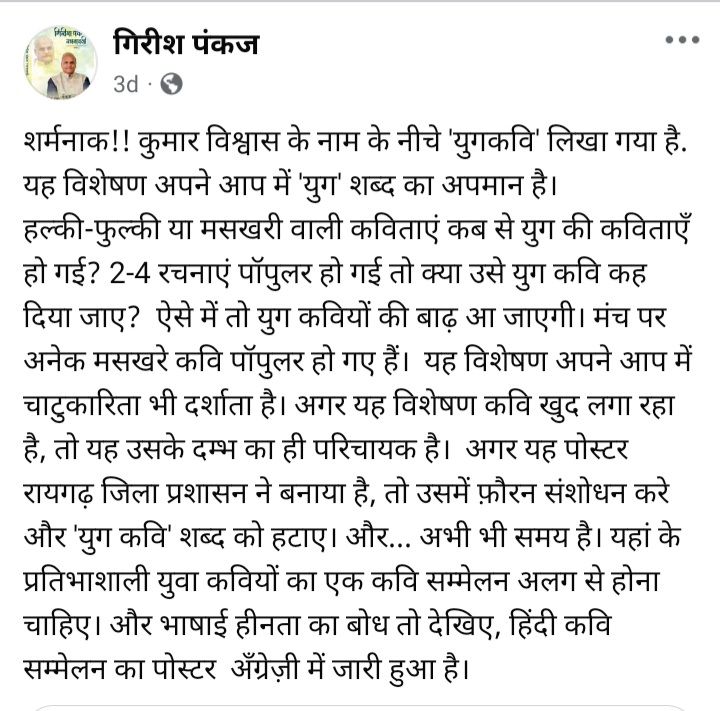 “शर्मनाक!! कुमार विश्वास के नाम के नीचे ‘युगकवि’ लिखा गया है. यह विशेषण अपने आप में ‘युग’ शब्द का अपमान है। हल्की-फुल्की या मसखरी वाली कविताएं कब से युग की कविताएँ हो गईं?…”
