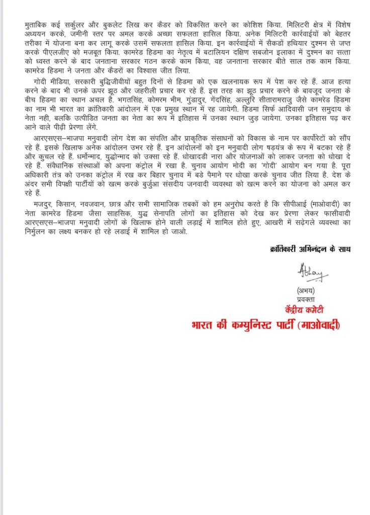 बस्तर। नक्सलियों ने माओवादी संगठन के कुख्यात नेता हिड़मा की मौत के मुद्दे पर 23 नवम्बर को देशव्यापी प्रतिरोध दिवस मनाने की घोषणा की है, नक्सलियों की केंद्रीय कमेटी के प्रवक्ता अभय द्वारा एक प्रेस नोट जारी कर यह जानकारी दी गई।