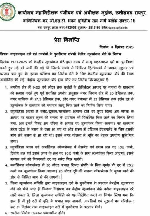 रायपुर। छत्तीसगढ़ में जमीन की खरीद–बिक्री के लिए लागू की गई नई कलेक्टर गाइडलाइन दरों ने पूरे प्रदेश में तीखी प्रतिक्रिया को जन्म दे दिया है,कई जिलों में सरकारी दरों में 100% तक बढ़ोतरी दर्ज की गई है, जबकि कुछ क्षेत्रों में यह बढ़ोतरी कई गुना बताई जा रही है, अचानक बढ़ी दरों से आम नागरिक, किसान, व्यवसायी और रियल एस्टेट से जुड़े लोगों के साथ–साथ राजनीतिक दलों में भी व्यापक नाराज़गी देखने को मिल रही है।
