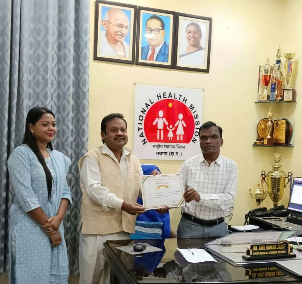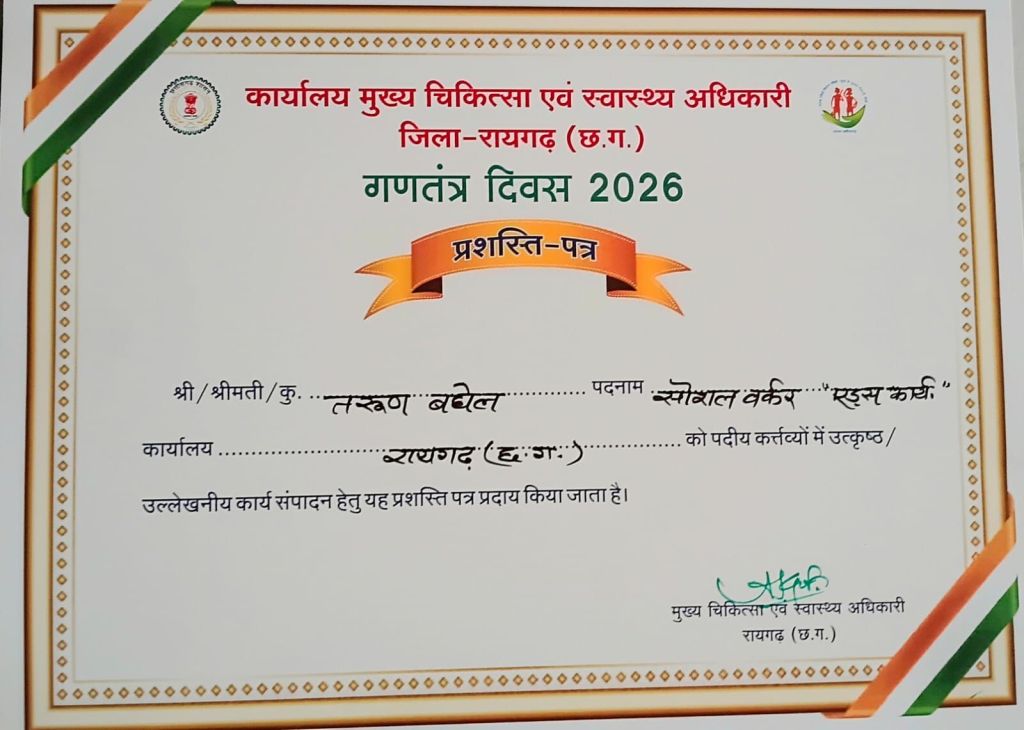 इस अवसर पर जिले के मुख्य चिकित्सा एवं स्वास्थ्य अधिकारी (CMHO) डॉ. अनिल कुमार जगत ने तरुण बघेल को प्रशस्ति पत्र सौंपते हुए, उनके समर्पण और सामाजिक प्रतिबद्धता की सराहना की कार्यक्रम में जिला कार्यक्रम प्रबंधक (DPM) रंजना पैंकरा एवं मीडिया प्रभारी उमा महंत की गरिमामयी उपस्थिति रही।