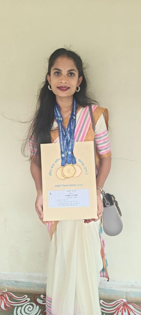 गंडई। गंडई से मात्र 3 किलोमीटर दूर स्थित ग्राम गोकना की प्रतिभाशाली छात्रा सरला साहू ने क्षेत्र का नाम रोशन किया है। इंदिरा कला संगीत विश्वविद्यालय, खैरागढ़ के 17वें दीक्षांत समारोह (दिनांक 28 जनवरी) में सरला साहू को संगीत संकाय सत्र 2022–23 की एम.पी.ए. (गायन) परीक्षा में प्रावीण्य सूची में प्रथम स्थान प्राप्त करने पर चार स्वर्ण पदकों से सम्मानित किया गया।