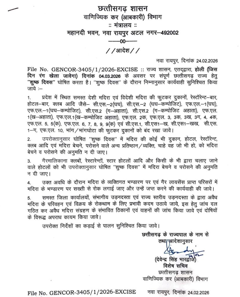 रायपुर। होली पर्व को लेकर छत्तीसगढ़ सरकार ने बड़ा फैसला लिया है। राज्य में 4 मार्च 2026 को होली के अवसर पर संपूर्ण प्रदेश में शुष्क दिवस (ड्राई डे) घोषित किया गया है, इस दिन सभी शराब दुकानें, बार और मदिरा से जुड़े अन्य प्रतिष्ठान बंद रहेंगे,इस संबंध में छत्तीसगढ़ आबकारी विभाग ने आधिकारिक आदेश जारी किया है,आदेश के अनुसार, होली के दिन देशी और विदेशी मदिरा की सभी फुटकर दुकानों पर बिक्री पूरी तरह प्रतिबंधित रहेगी,आबकारी विभाग ने स्पष्ट किया है कि आदेश का कड़ाई से पालन कराया जाएगा।