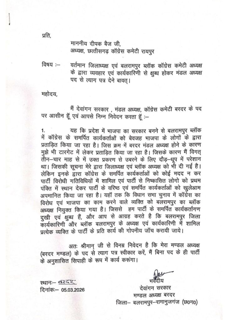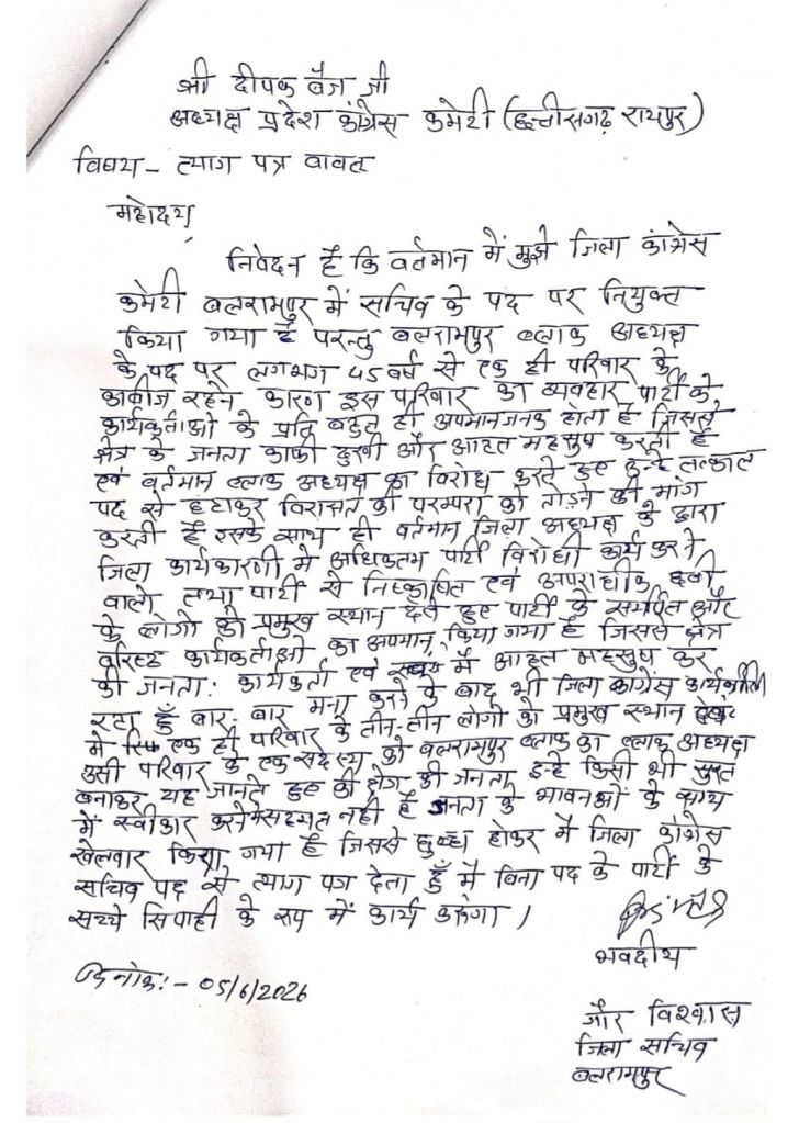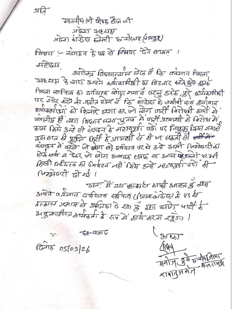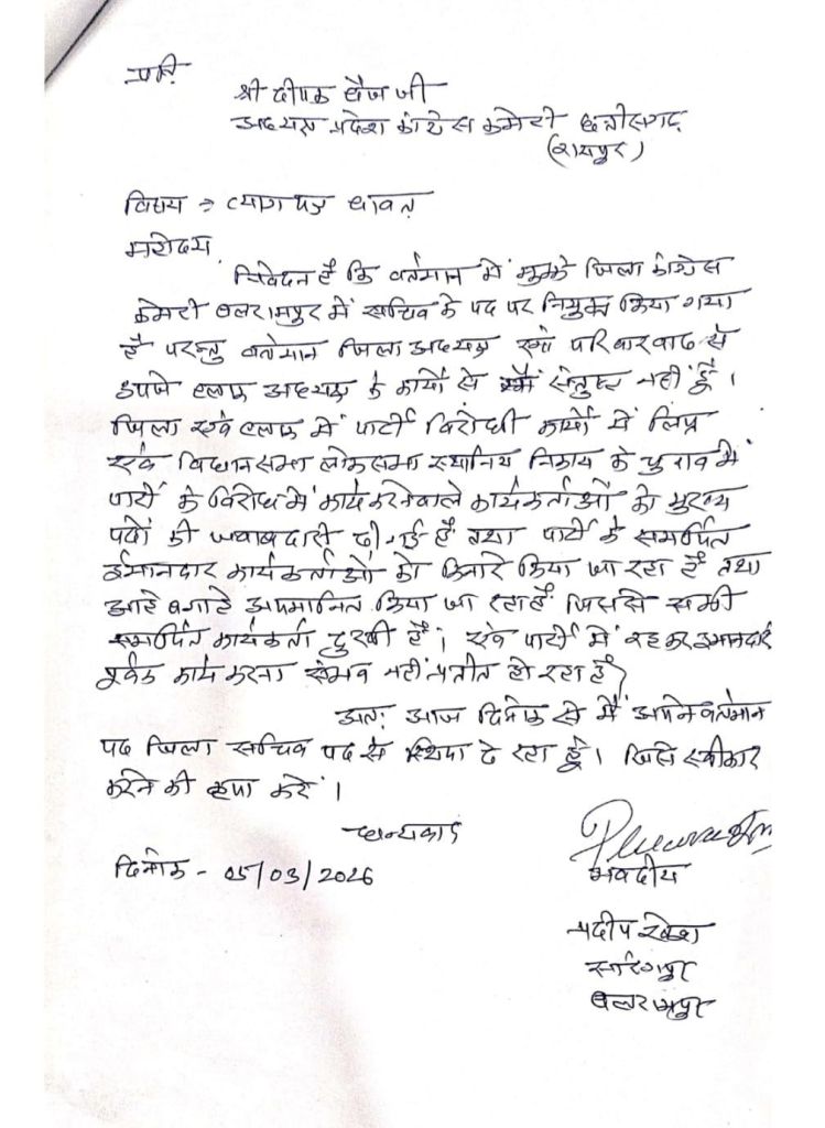 बलरामपुर। बलरामपुर जिला कांग्रेस कमेटी में अंदरूनी कलह तेज हो गई है,संगठन के भीतर असंतोष के चलते पद से इस्तीफे का सिलसिला शुरू हो गया है, एक साथ तीन जिला सचिव और पांच मंडल अध्यक्षों ने अपने-अपने पद से इस्तीफा दे दिया है, जिससे पार्टी में हड़कंप मच गया है।