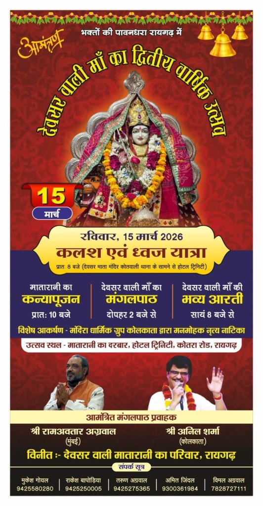 रायगढ़। शहर में 15 मार्च को कुलदेवी देवसर वाली दुर्गा माता का भव्य दरबार सजने जा रहा है,इस धार्मिक आयोजन को लेकर भक्तों में खासा उत्साह देखा जा रहा है,कार्यक्रम का आयोजन होटल ट्रिनिटी में किया जाएगा, जिसमें बड़ी संख्या में श्रद्धालुओं के शामिल होने की संभावना है,आयोजन की शुरुआत सुबह 8 बजे देवसर मंदिर (सिटी कोतवाली के सामने) से ध्वज यात्रा एवं कलश यात्रा के साथ होगी,धूमधाम से निकाली जाने वाली यह यात्रा शहर के विभिन्न मार्गों से होते हुए होटल ट्रिनिटी पहुंचेगी, जहां यात्रा का विश्राम होगा।