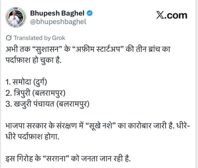 पूर्व मुख्यमंत्री भूपेश बघेल ने सोशल मीडिया पर पोस्ट करते हुए भाजपा सरकार पर निशाना साधा। उन्होंने लिखा कि अभी तक “सुशासन” के “अफीम स्टार्टअप” की तीन ब्रांच का पर्दाफाश हो चुका है—