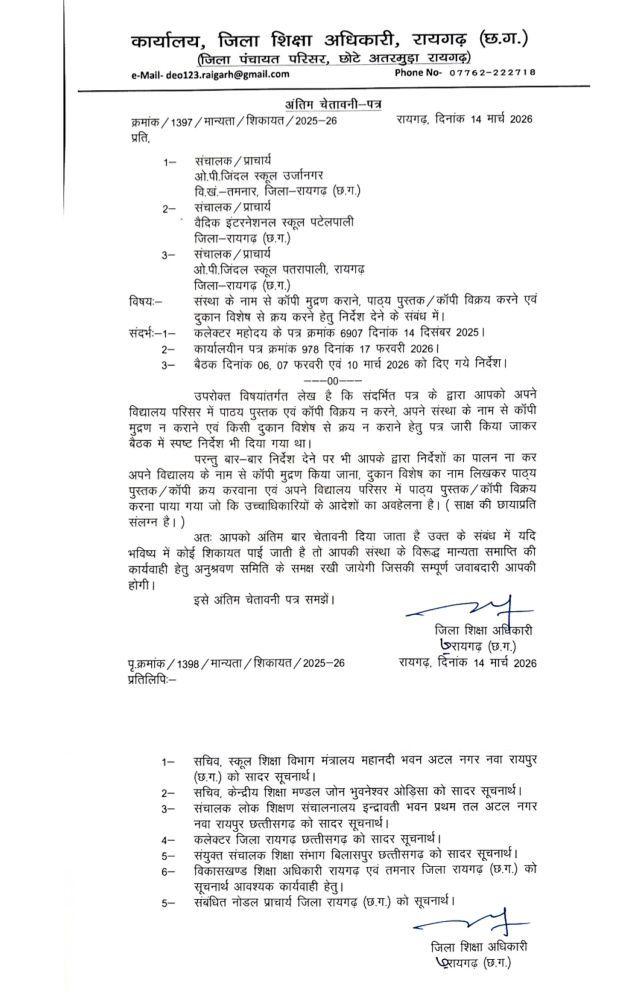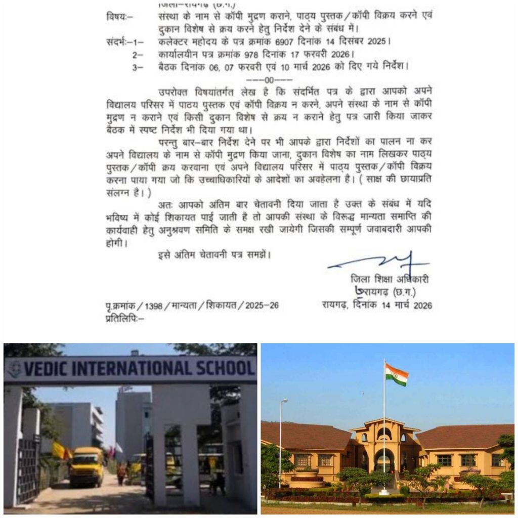 रायगढ़। जिले में निजी स्कूलों द्वारा मनमानी और अभिभावकों को महंगी किताबें-कॉपी खरीदने के लिए मजबूर करने के मामले में प्रशासन ने सख्त रुख अपनाया है,लगातार मिल रही, शिकायतों और मीडिया में खबरें सामने आने के बाद जिला शिक्षा अधिकारी (डीईओ) ने मामले को गंभीरता से लेते हुए वैदिक और जिंदल स्कूल प्रबंधन को अंतिम चेतावनी पत्र जारी किया है। पत्र में स्पष्ट कहा गया है कि यदि भविष्य में इनके खिलाफ फिर कोई शिकायत मिलती है, तो सीधे मान्यता समाप्ति की कार्रवाई की जाएगी।